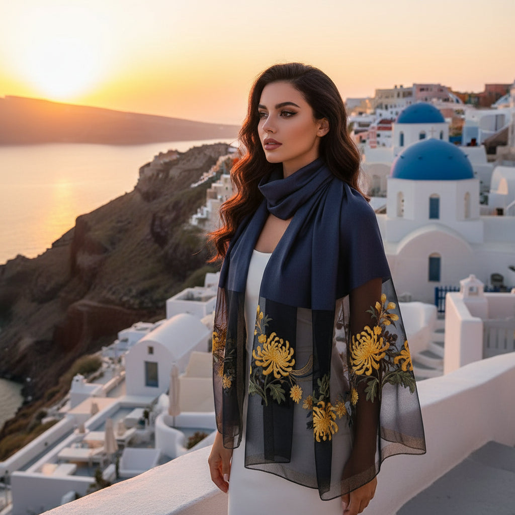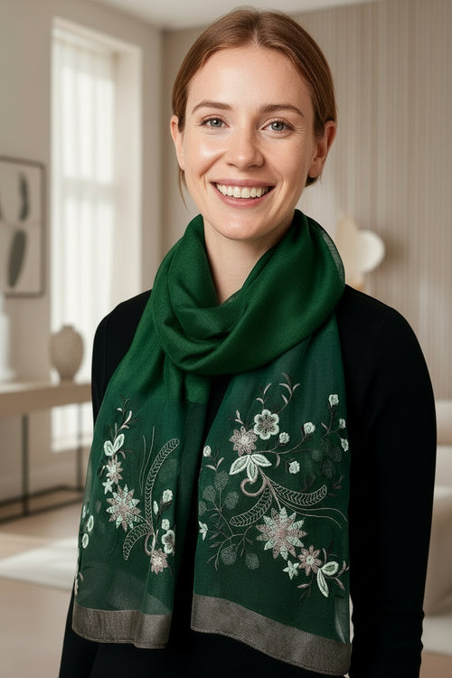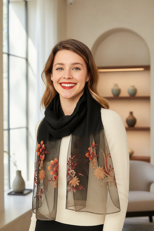 Every scarf features intricate floral patterns stitched with rich colors for a luxurious, eye-catching finish