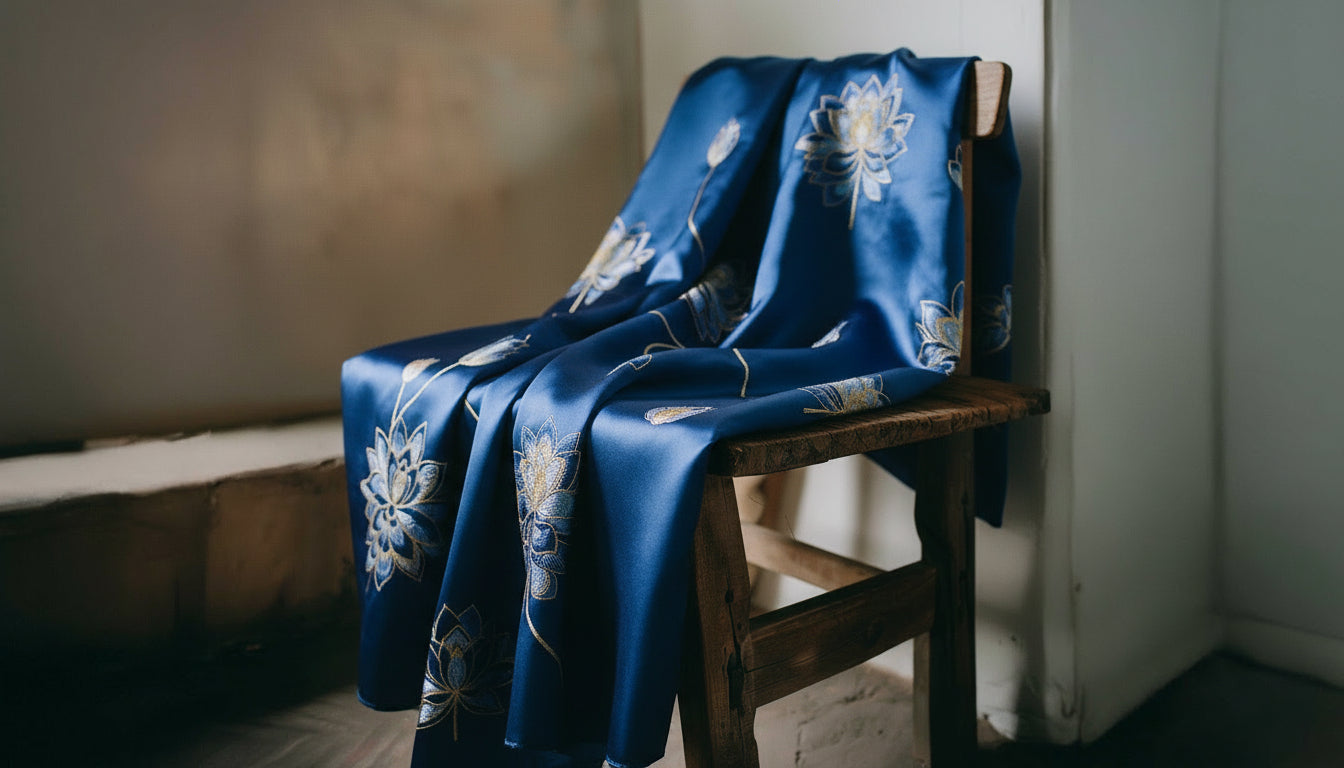 Experience the seamless fusion of luxurious silk and intricate embroidery.